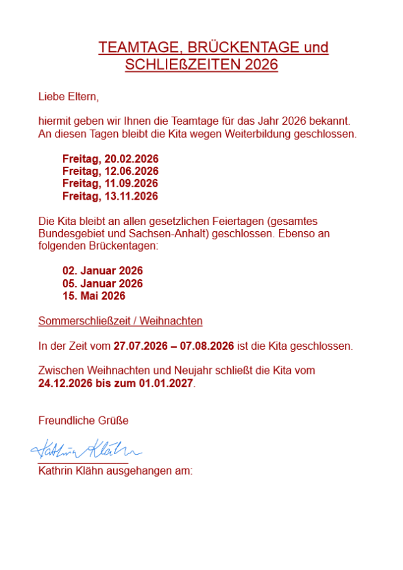 Teamtage und Schließzeiten 2026
